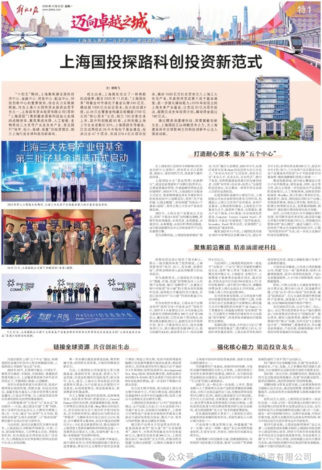 新时代新征程,上海国投始终胸怀“国之大者”,立足服务国家战略全局和上海国际科技创新中心建设的核心使命,持续书写国有资本服务高水平科技自立自强的高质量答卷,为全面提升上海“五个中心”核心功能,加快构建以国内大循环为主体、国内国际双循环相互促进的新发展格局,贡献不可替代的国资力量。