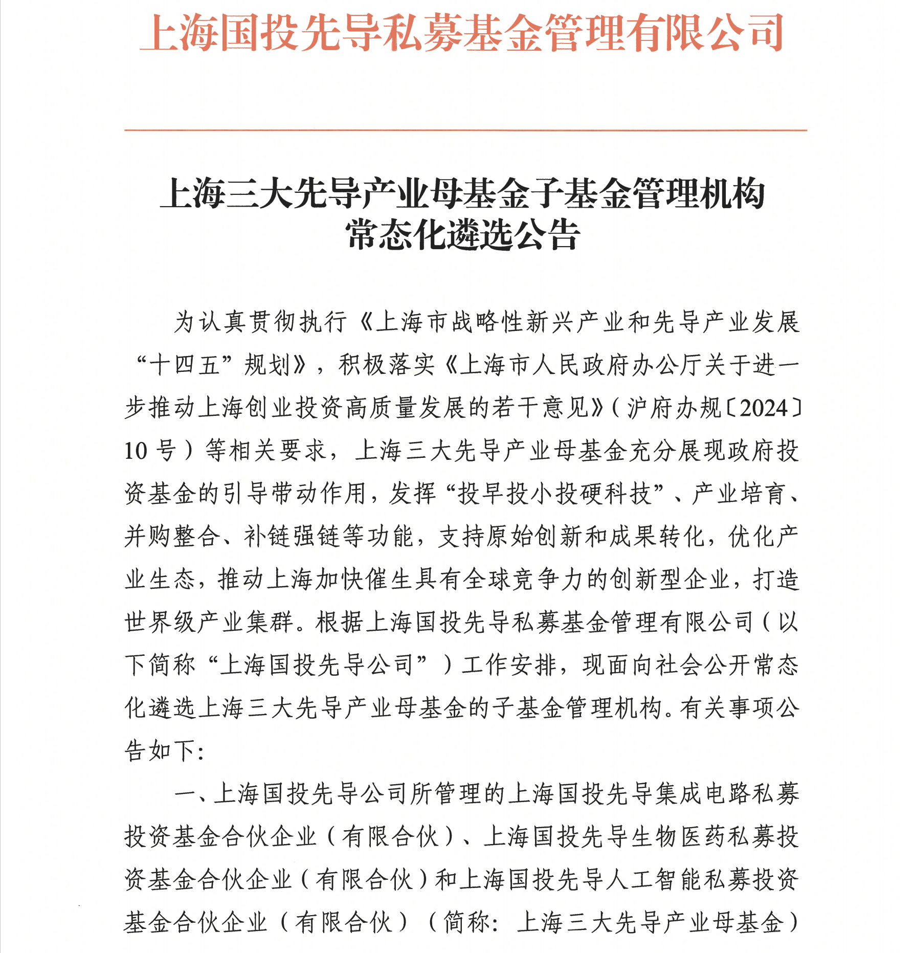 上海三大先导产业母基金子基金管理机构常态化遴选公告